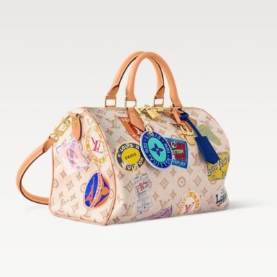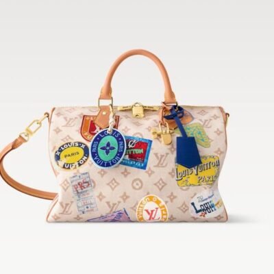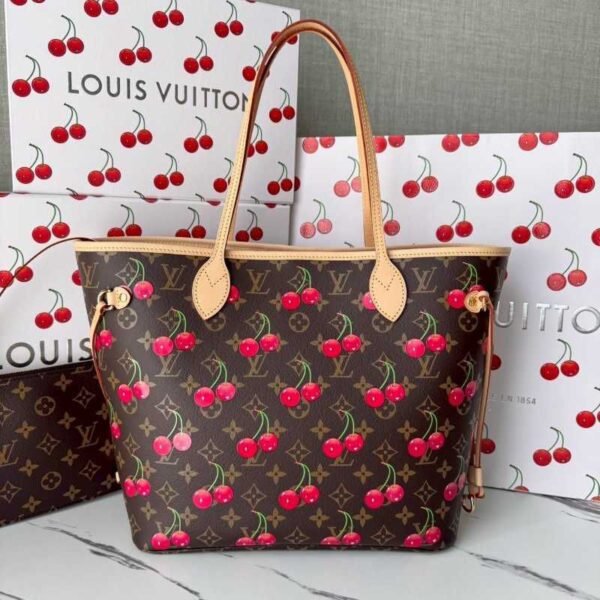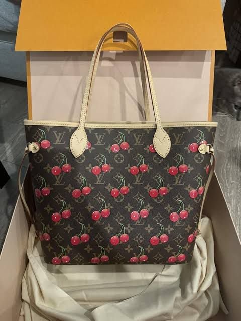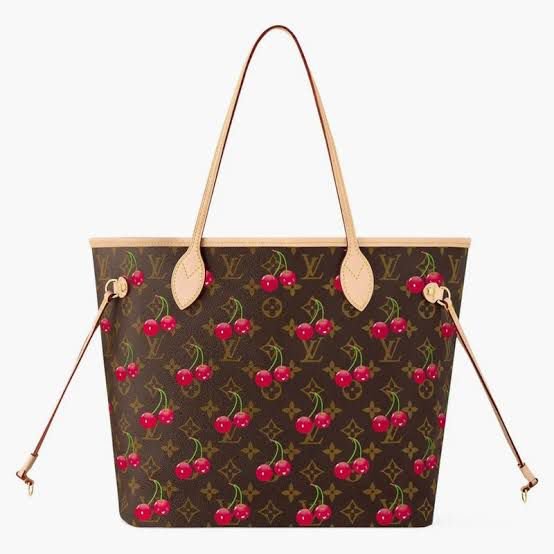 The iconic Neverfull MM handbag is vibrantly reimagined with joyful codes from the re-edition of the coveted Louis Vuitton x Murakami collection. It is crafted from classic Monogram coated canvas that is playfully scattered with cheerful cherry motifs in the artist’s signature colorful aesthetic, which is subtly echoed by a bold striped lining. Natural cowhide leather trims underscore the timeless look.