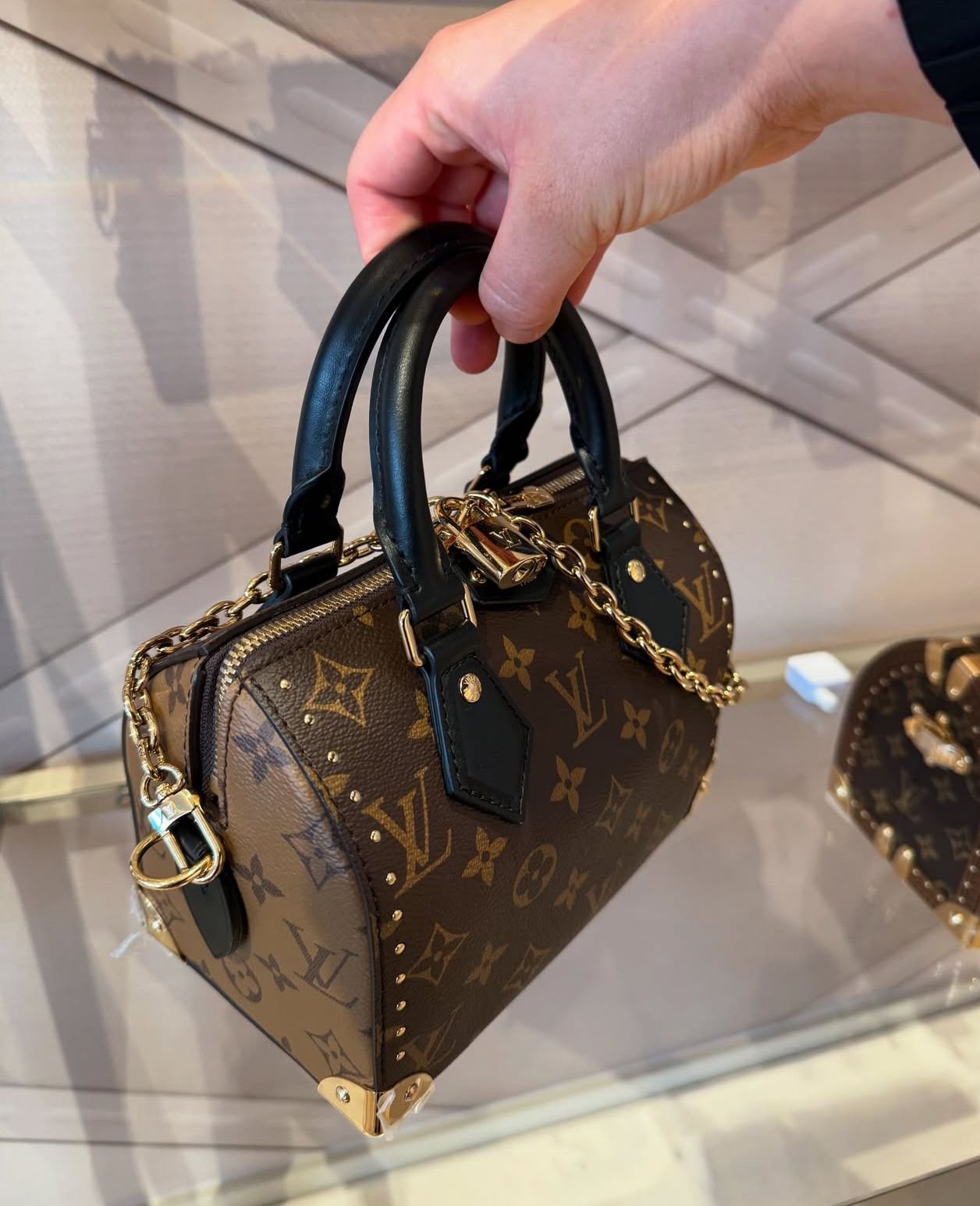 Reimagined with a bold new vision, the iconic Speedy Trunk was introduced for the Cruise 2025 runway. Elevated with heritage trunk details in a sleek gold-tone finish, this edition is crafted from the House’s Monogram canvas with contrasting Monogram reverse trims – iconic signature of Nicolas Ghesquière. Both the strap and chain are removable, and it can be worn cross-body, over the shoulder, or carried by hand.